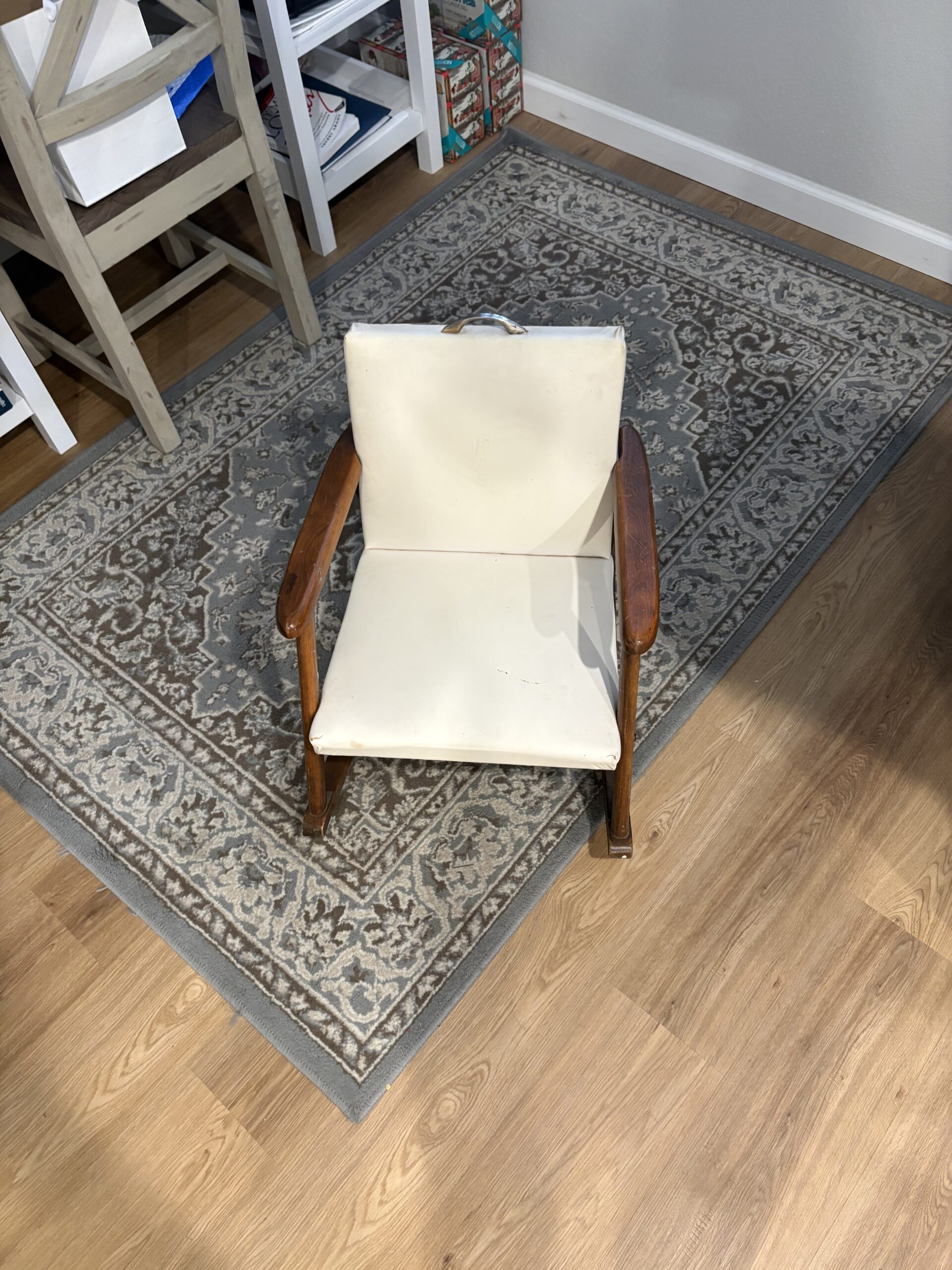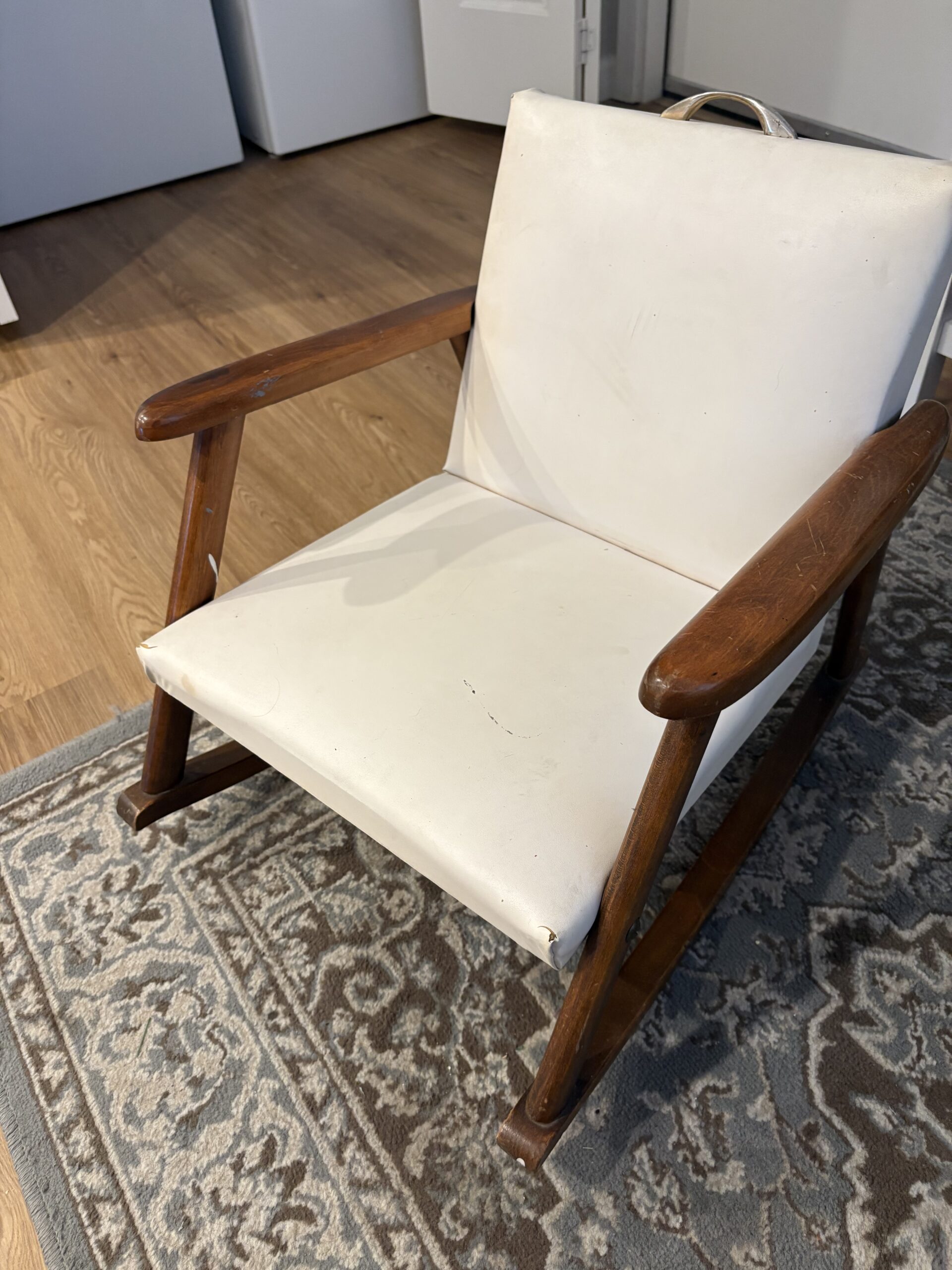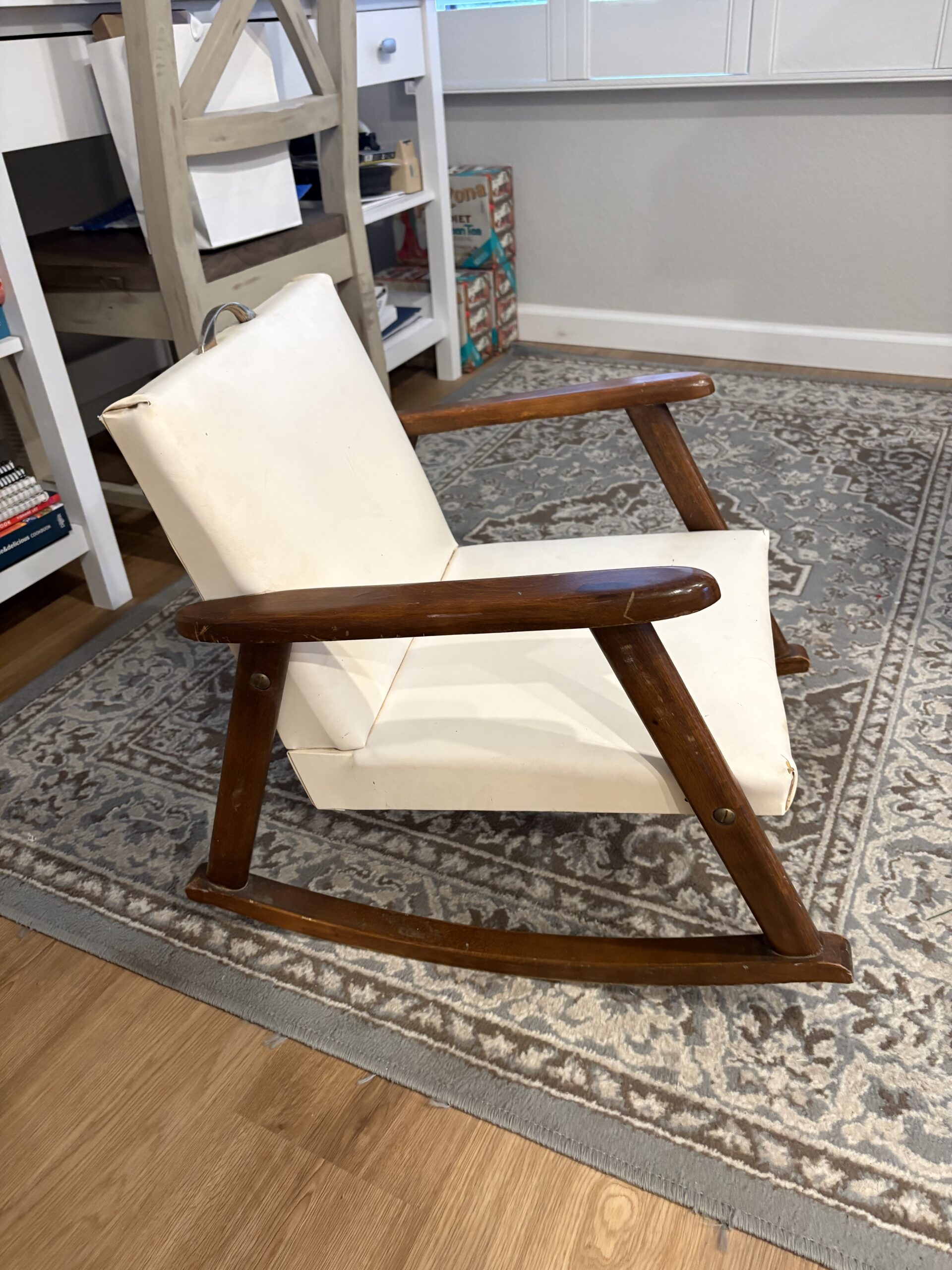 This cute little rocker is about 63 years old. It’s quite sentimental, but neither of my children want it. It’s not perfect but a little child would sure love having their own grown-up chair. Imitation leather with grass button finishing. Seat made of urethane foam. The arms and rockers appear to be pinePlease see pictures up close to see the little bit of wear on the front of the seat pad. I am asking $10 for this. Thank you for looking