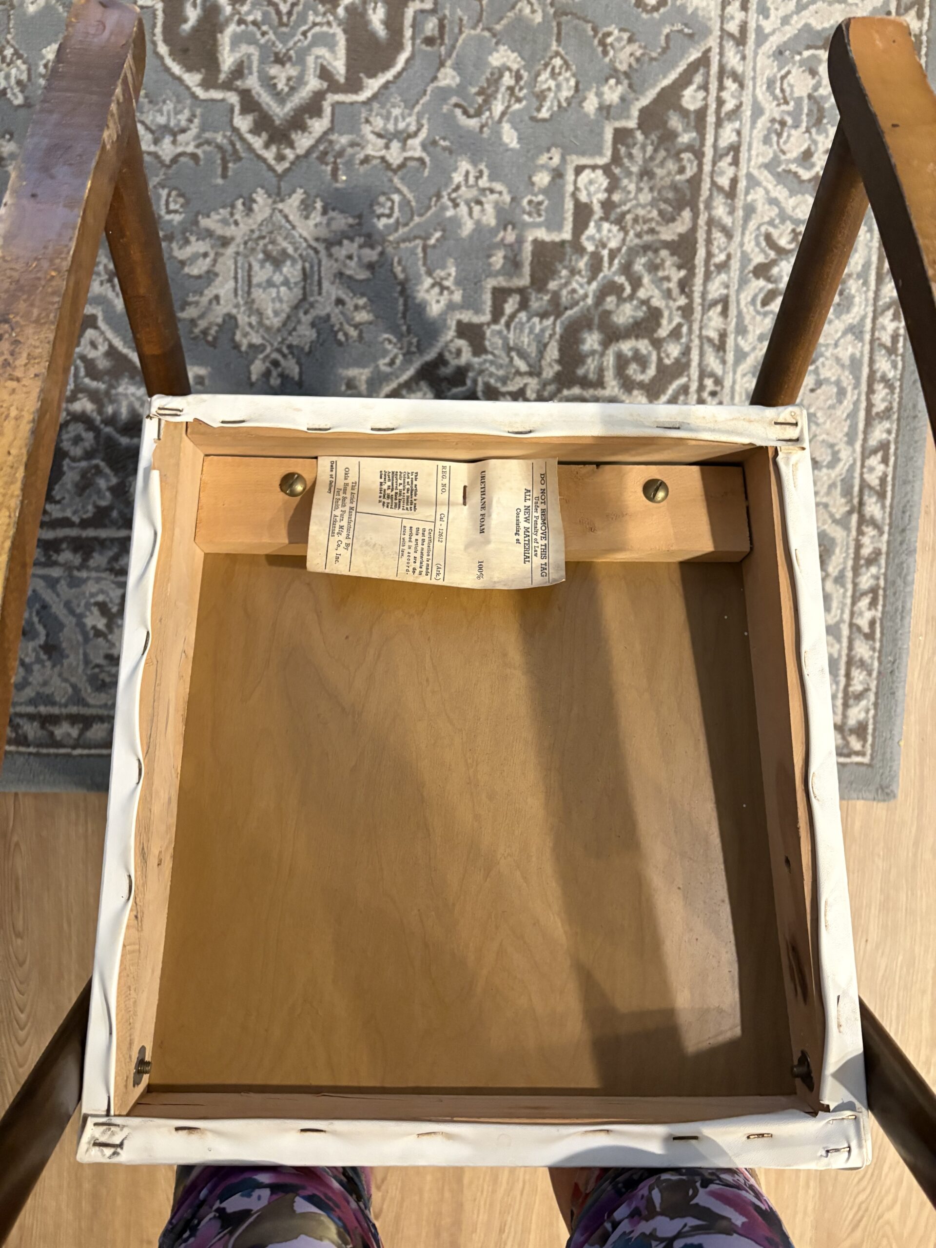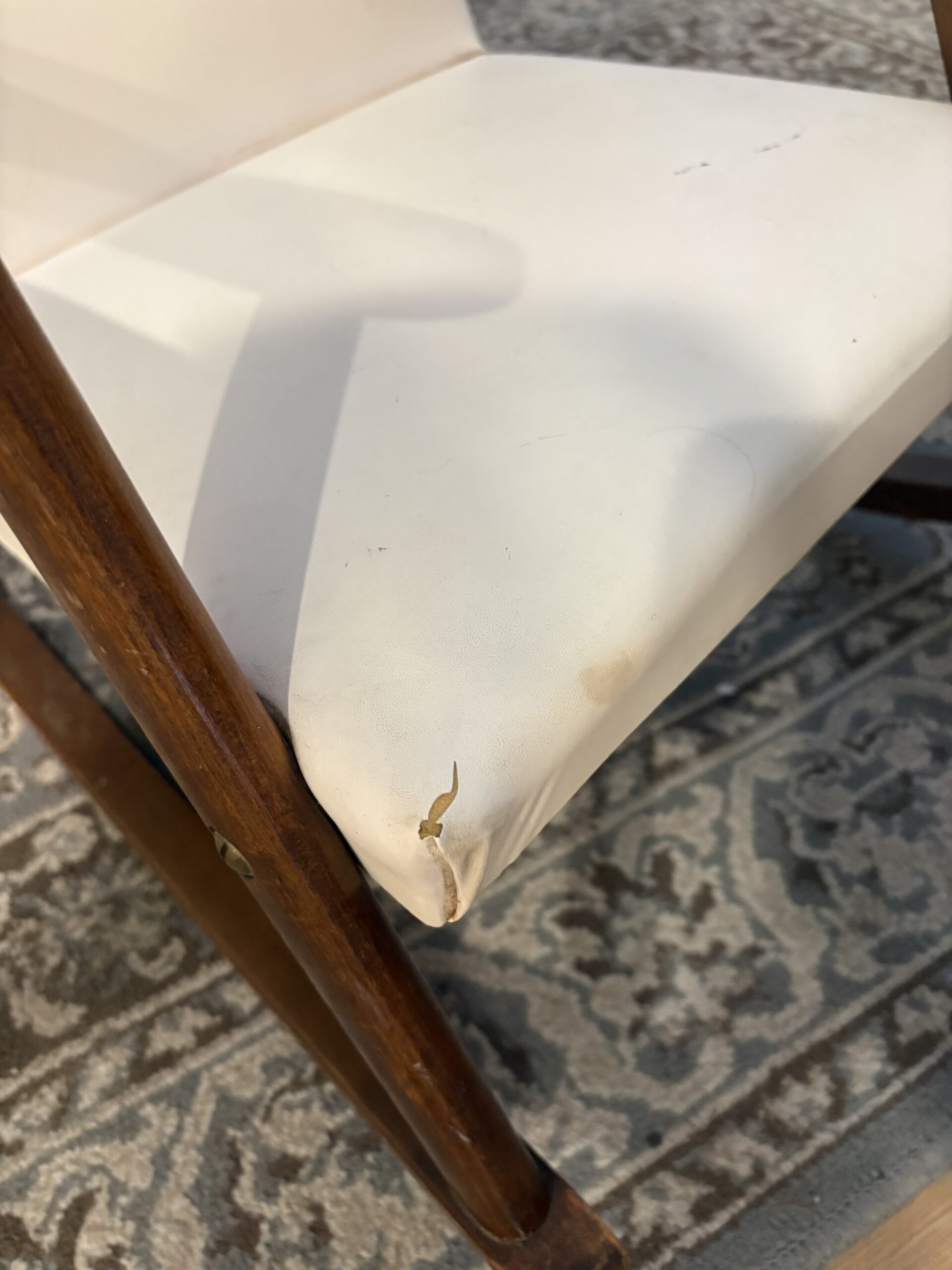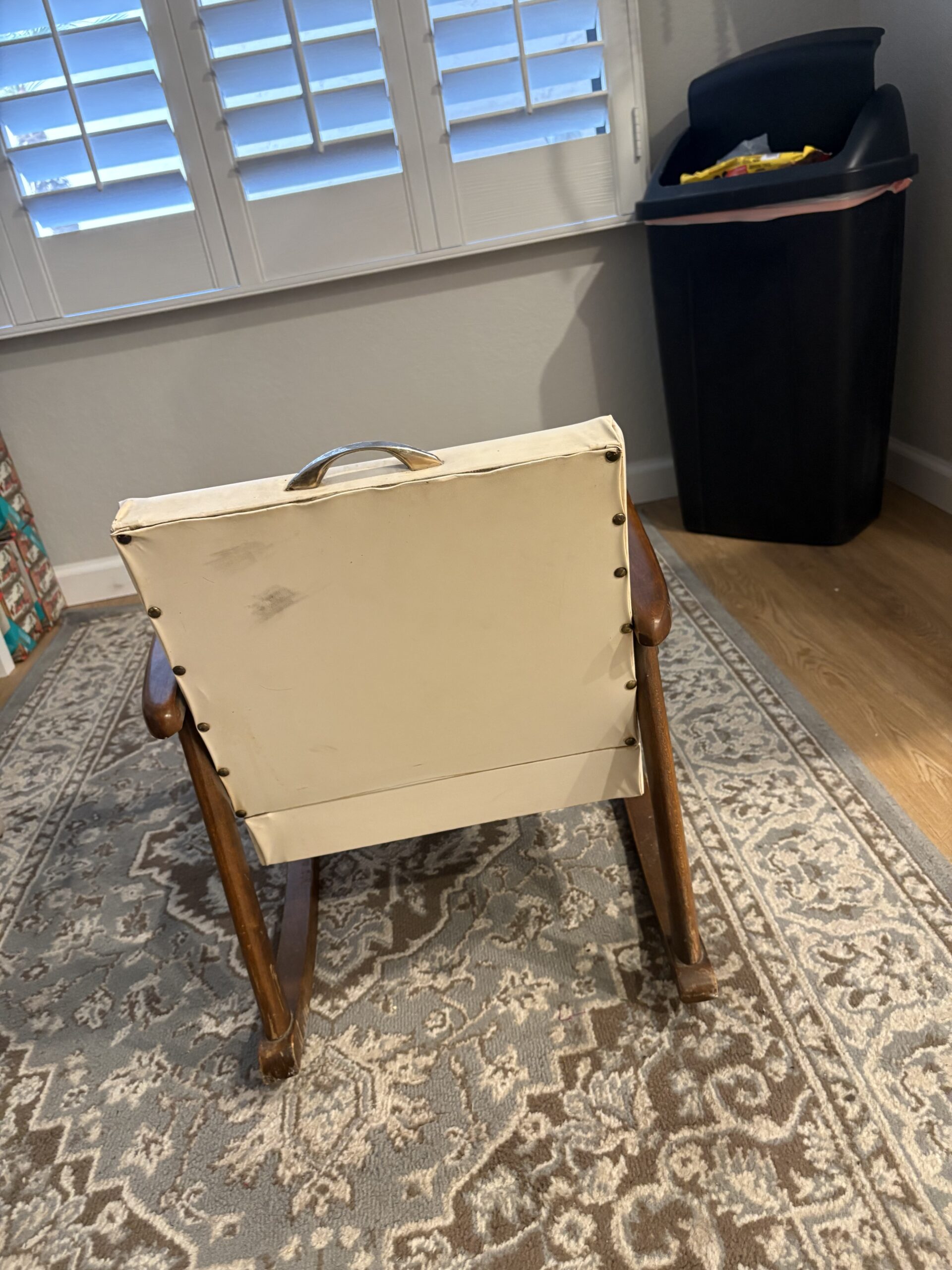 This cute little rocker is about 63 years old. It’s quite sentimental, but neither of my children want it. It’s not perfect but a little child would sure love having their own grown-up chair. Imitation leather with grass button finishing. Seat made of urethane foam. The arms and rockers appear to be pinePlease see pictures up close to see the little bit of wear on the front of the seat pad. I am asking $10 for this. Thank you for looking